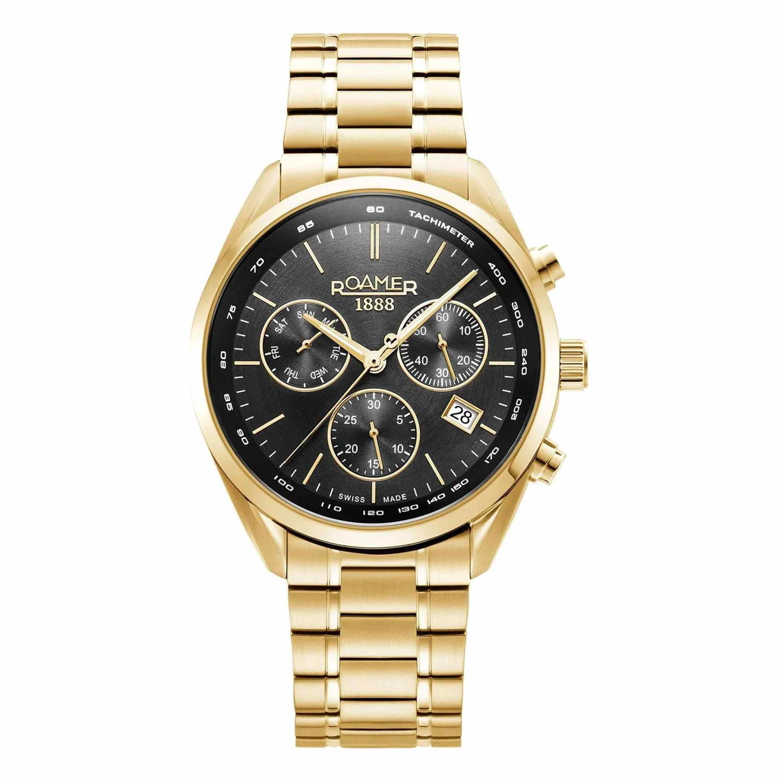 The Roamer men’s quartz chronograph watch features a 42mm gold stainless steel case with a sleek black dial. Powered by the Swiss-made Ronda Z60.D1 movement, it offers precise timekeeping and includes chronograph functionality. The watch is water-resistant to 100 meters (10 ATM) and is complemented by a gold stainless steel bracelet with a butterfly clasp.